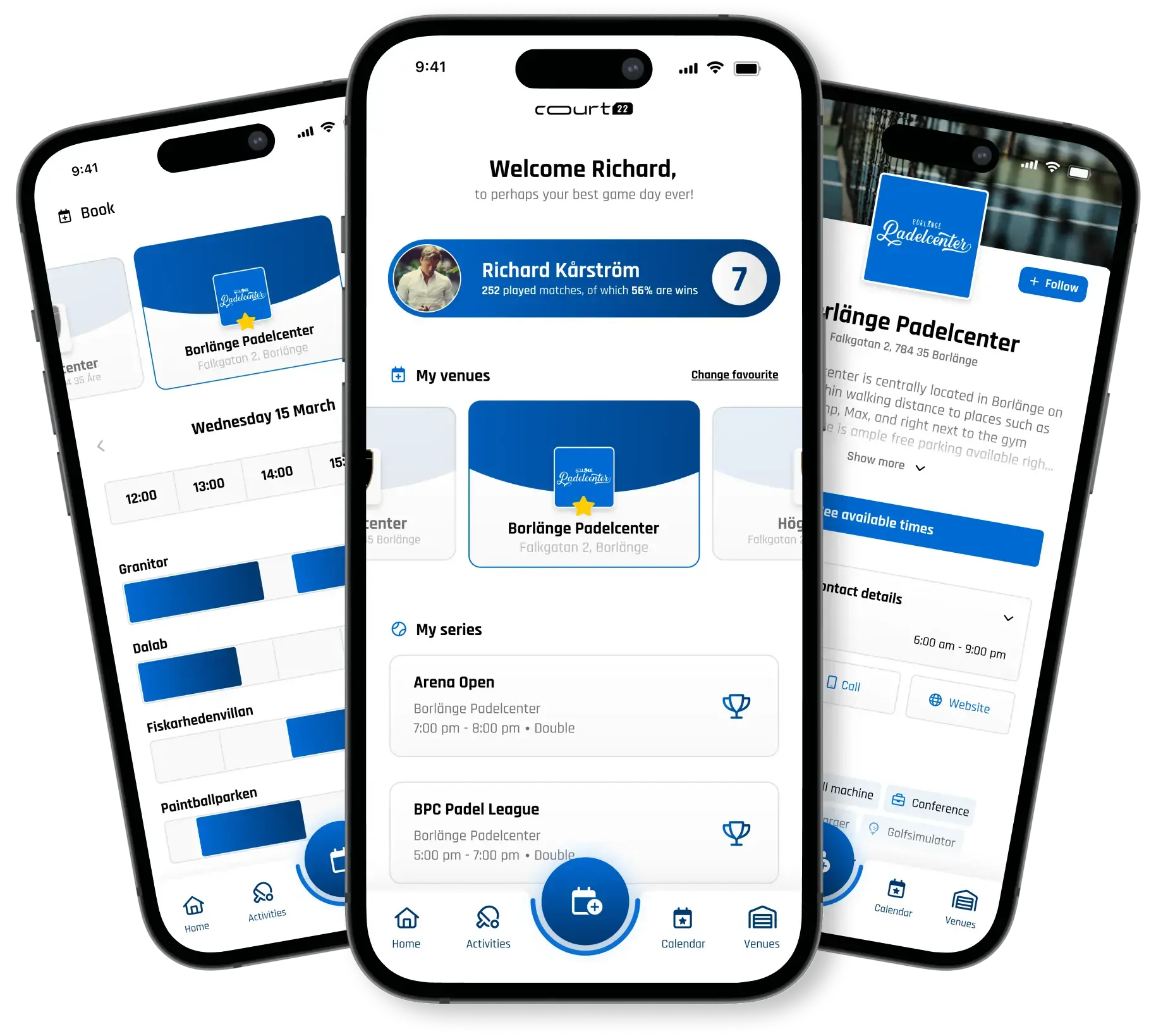 Keep track of your bookings in the calendar, fill in results, participate in events & leagues, and invite your friends!