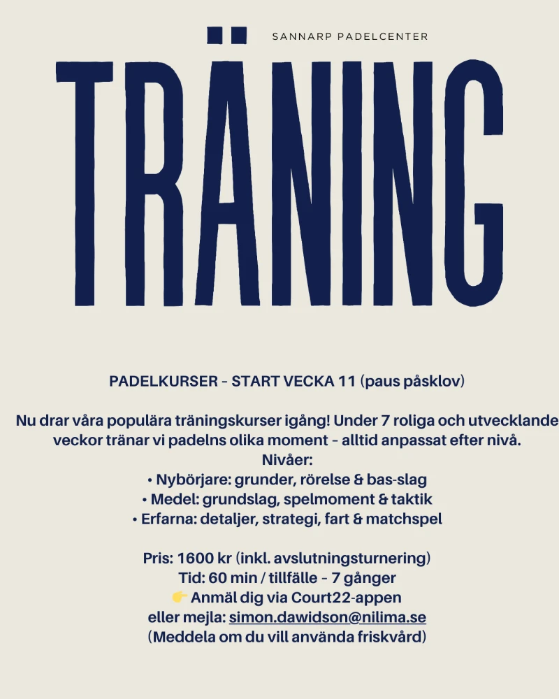 Välkommen till våra populära träningskurser på Padelcenter Sannarp! Våra kurser sträcker sig över 7 veckor och är anpassade för olika nivåer, så att du kan utveckla ditt spel i en inspirerande miljö.